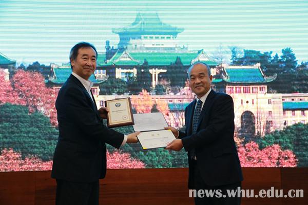 新闻网讯(通讯员范锡龙)6月22日,珞珈讲坛第298讲,2015年诺贝尔物理学奖获得者梶田隆章(Takaaki Kajita)带来了“Researches in Kamioka -neutrinos and gravitational waves(在神冈的研究工作-中微子和引力波)”的学术报告。校长窦贤康为其颁发珞珈讲坛纪念证书。