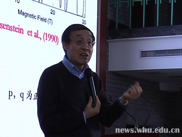 ▲珞珈讲坛第162讲3月3日举行,中国科学院院士谢心澄作题为“量子材料:超导及拓扑绝缘体”的报告,校长窦贤康为其颁发纪念证书。(李伟国摄)